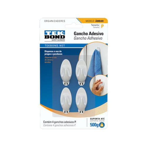 Gancho Adesivo Âmbar de Plástico Branco P Tekbond A linha de ganchos e organizadores adesivos da Tekbond oferece uma solução prática e resistente que permite decorar e organizar a sua casa ou o seu ambiente de trabalho. Marca: Tekbond Part number: 20801000202 Modo de Usar: 1. Limpe a superfície com álcool, removendo qualquer resquício de oleosidade ou poeira. Importante: O uso de detergentes ou outros produtos pode comprometer o desempenho da fita adesiva. 2. Remova o liner protetor da fita e aplique o produto no local desejado. 3. Faça pressão na peça por 30 segundos com certa força para potencializar a resistência da fita. 4. Aguarde 1 hora antes de utilizar o gancho. Importante: 1. Quanto maior a área de contato da fita, mais resistente é a aplicação. Por este motivo, não aplique os ganchos em superfícies irregulares, curvas ou com texturas. 2. As fitas não foram projetadas para suportar objetos tridimensionais de grande volume como, por exemplo, prateleiras. Não recomenda-se a aplicação de ganchos e fitas para objetos que fazem a pressão em forma de pêndulo. 3. Verifique a superfície onde será aplicada a fita / gancho. No momento da remoção, o adesivo da fita pode danificar superfícies com pintura ou reboco mal fixados e sem resistência. 4. Confira a carga de resistência para cada um dos produtos descritos nesta embalagem. Para Remover a Fita Permanente: 1. Passe um fio de Nylon ou similar - vagarosamente - entre a parede e o produto para soltar a fita adesiva. 2. Durante este processo, algum resíduo de fita pode ficar na parede. Utilize uma esponjinha com água e sabão para a limpeza da área. Para Remover a Fita Smart Removível: 1. Quando necessário, retire o gancho do suporte para ter acesso a lingueta da fita. Caso contrário, a lingueta já estará visível no produto. 2. Segure o suporte ou o gancho com uma das mãos e com a outra, puxe a lingueta para baixo, paralela à parede, até descolar totalmente a fita da parede. Nota: Uma vez removidas, as fitas não são reaproveitáveis. Especificações Produto: Modelo Âmbar P: Medida: 3x2,2cm Cor: branca Capacidade: 0,500 kg Unidades: 4 Ean: 7898543382492