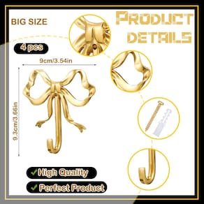 Características: Sombra dourada radiante: os ganchos de arco vêm em uma cor dourada radiante que exala elegância e sofisticação, este gancho de toalha dourado não apenas oferece função, mas também aumenta a estética de qualquer cômodo, os elegantes ganchos dourados podem iluminar seu banheiro, cozinha ou até mesmo sua área de estar! Opção de presente impressionante e decoração versátil: estes ganchos de laço dourados são mais do que apenas práticos, eles também são requintadamente projetados, eles também podem servir como um presente maravilhoso para meninas, adicionando um toque de elegância dourada ao seu espaço, ilumine sua vida diária com nossa decoração de arco de ouro! Especificações: Material: latão Cor: dourado Tamanho: 9,3 x 9 x 2 cm / 3,66 x 3,54 x 0,79 polegadas O pacote inclui: 4 x ganchos de arco Observações: Medição manual, permita pequenos erros de tamanho. A cor pode existir uma pequena diferença devido a diferentes telas. - Abundância em cada pacote: cada conjunto inclui 4 ganchos dourados com nó de laço, dando a você uma quantidade suficiente para atender a todas as suas necessidades; você pode compartilhá-los com a família ou usá-los em diferentes cômodos - Seu gancho de parede ideal: estes ganchos de arco deslumbrantes são feitos de material de latão de qualidade que garante durabilidade e robustez; Estes ganchos de parede de latão têm uma forte capacidade de transporte que pode pendurar seus itens com segurança sem deterioração; o material também é à prova d'água, à prova de ferrugem e não desbota facilmente, garantindo longevidade - Dimensões adequadas para qualquer espaço: com a dimensão desejada de 9,3 x 9 x 2 cm / 3,66 x 3,54 x 0,79 polegadas, esses ganchos de arco dourados podem se encaixar perfeitamente em qualquer espaço; Este tamanho os torna ideais para implementar em diferentes configurações de sala sem ocupar muito espaço - Montagem fácil e conveniente: nossos ganchos de parede de arco são incrivelmente fáceis de usar; cada gancho de arco é equipado com parafusos de montagem junto com um método de instalação simples, tornando o processo sem complicações - Adequado para uma variedade de usos: além de sua bela decoração de parede com nó de laço, esses ganchos de arco funcionam como um local seguro para pendurar roupas, casacos, chapéus, bolsas, toalhas, roupões de banho, chaves, carteiras, gravatas e muito mais; Eles são adequados para uso em entradas, salas de estar, cozinha, banheiro, quartos, jardim, guarda-roupa, varanda e outros lugares