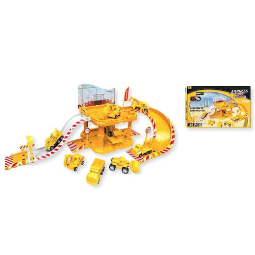 A Garagem de Construção Express Wheels vem com uma garagem e um veículo, oferecendo tudo o que é necessário para a brincadeira. As dimensões do produto montado são de 19x24x55 centímetros.