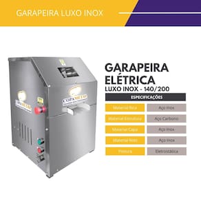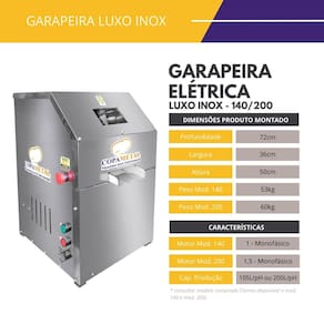 Garapeira Moenda de Cana Elétrica Luxo Inox FC200 220v FC2 A Garapeira Luxo Inox 200 FC2 é ideal para quem busca maior desempenho na extração de caldo de cana. Equipada com motor de 1,5 CV e moenda em inox, ela é perfeita para locais com alta demanda como feiras, quiosques e lanchonetes. Com capacidade para até 200 litros por hora, oferece rendimento elevado com economia e facilidade de uso. Sua estrutura reforçada em aço carbono com acabamento inox garante higiene e longa vida útil, mesmo em uso contínuo. Informações sobre o equipamento Peso: 60 kg Capacidade de produção: até 200 litros/hora Tensão: 220v Motor: 1,5 CV – Monofásico Potência: 1103,2 W Rotação do motor: 1750 rpm Rotação da moenda: 28 rpm Consumo elétrico: 1,10 kW/h Composição Material da estrutura: Aço Carbono Material da capa: Aço Inox Material da moenda: Aço Inox Material da bica: Aço Inox Pintura: Eletrostática Resistente Dimensões do equipamento Altura: 50 cm Largura: 36 cm Profundidade: 72 cm Garantia3 Meses Contra Defeito de Fabricação Ean: 7898697032595