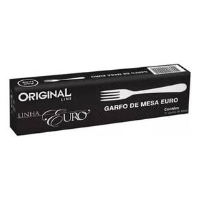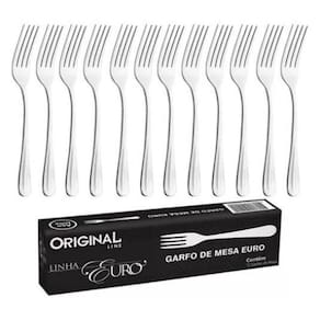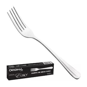 A linha euro é sinônimo de luxo e sofisticação, possui qualidade e acabamento impecável. Cuidados: Para manter seus talheres sempre brilhando, lave com esponja macia, sabão ou detergente neutro. Produtos abrasivos como palha de aço podem riscar e prejudicar o brilho Seque imediatamente para evitar manchas Recomenda-se o uso de água quente para melhorar o brilho Não guarde em local úmido, a umidade pode provocar manchas. Ficha técnica : 12 garfos de mesa 2,6x19,8 espessura do cabo 2,5mm, peso por peça 0,036kg.