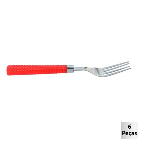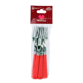 Garfo de Mesa Inox Plástico 06 Pçs Gramado - Kit garfo de mesa Linha Gramado da Praticasa, de aço inox com cabo plástico decorado;\n- Material de alta qualidade;\nEspecificações:\nMarca : GN COMERCI\nTipo de material : Aço inox\nCores ou Estampa : Vermelho\nDimensões do Produto : 19,5 X 2,5 X 1 CM\nDimensões da Embalagem : 26 X 7,5 X 2 CM\nPeso Bruto (Gramas) : 0.162 Marca: Não Informado