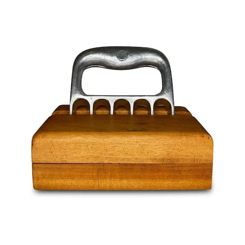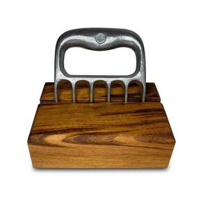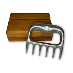 Garfo Garra de Urso Premium Polido com Suporte de Madeira TMB - Churrasco A garra de urso tem 6 pontas afiadas e serve para desfiar e dar suporte ao cortar a carne e outros alimentos, oferecendo maior segurança e firmeza. Com seu design imponente e diferenciado, proporciona uma excelente empunhadura e é uma ferramenta indispensável para o bom churrasqueiro. Acompanha base de madeira.