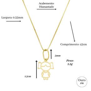 Seja bem-vindo(a) ao grupo DR Joias _x005F_x005F_x005F_x005F_x005F_x005F_x005F_x000D_ _x005F_x005F_x005F_x005F_x005F_x005F_x005F_x000D_ A DR joias traz a segurança que você precisa para comprar a sua joia online. Somos especializados em joias de Ouro 18k e de Prata 925, com experiência de quase 10 anos em vendas pela internet. _x005F_x005F_x005F_x005F_x005F_x005F_x005F_x000D_ _x005F_x005F_x005F_x005F_x005F_x005F_x005F_x000D_ Temos uma grande variedade de produtos para agradar a todos os estilos, proporcionando o que há de melhor em joias. Procuramos ir além de atender as suas necessidades, queremos superar as suas expectativas!!!_x005F_x005F_x005F_x005F_x005F_x005F_x005F_x000D_ _x005F_x005F_x005F_x005F_x005F_x005F_x005F_x000D_ Todos os nossos produtos, possuem certificado de garantia de autenticidade do material, que podem ser testados ecomprovados em qualquer joalheria do Brasil._x005F_x005F_x005F_x005F_x005F_x005F_x005F_x000D_ Descrição da Corrente Feminina em Ouro 18k:_x005F_x005F_x005F_x005F_x005F_x005F_x005F_x000D_ Tamanho da corrente: 45cm_x005F_x005F_x005F_x005F_x005F_x005F_x005F_x000D_ Largura da corrente: 0,55 mm_x005F_x005F_x005F_x005F_x005F_x005F_x005F_x000D_ Peso total: 1.10 gramas_x005F_x005F_x005F_x005F_x005F_x005F_x005F_x000D_ Material: Ouro 18k_x005F_x005F_x005F_x005F_x005F_x005F_x005F_x000D_ Forma: MaciçaTamanho do Pingente: 1.5cm (Com o Passador)_x005F_x005F_x005F_x005F_x005F_x005F_x005F_x000D_ O destaque desta deslumbrante peça de joalheria é o encantador pingente em forma de menina. A menina é meticulosamente esculpida, capturando sua graça e inocência de forma inigualável._x005F_x005F_x005F_x005F_x005F_x005F_x005F_x000D_ Acompanha embalagem para guardar a sua joia._x005F_x005F_x005F_x005F_x005F_x005F_x005F_x000D_ Ouro 18k é um metal precioso altamente valorizado por sua durabilidade, beleza e brilho. Joias feitas com ouro 18k apresentam 75% de ouro puro combinado com outros metais, produzidas em uma liga forte e resistente perfeita para uso diário.