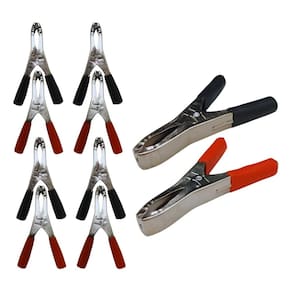 Corrente nominal: 50A Comprimento: 100mm Material do corpo: metal condutor com revestimento isolante Tipo de conexão: garra jacaré com mola interna Cores: preto e vermelho Formato de venda: par (2 unidades)