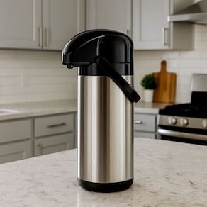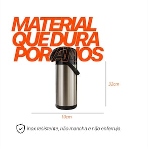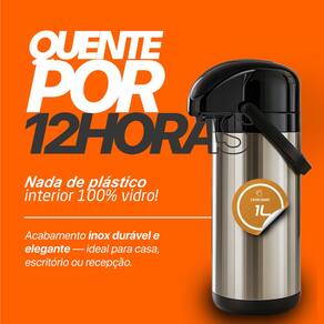 Capacidade de 1 litro Revestimento externo 100% em inox escovado Ampola interna de vidro que conserva a temperatura por longos períodos Serve líquidos quentes e frios Tampa com sistema de acionamento por pressão Alça ergonômica para facilitar o transporte Design moderno e resistente, ideal para casa, escritório ou comércio