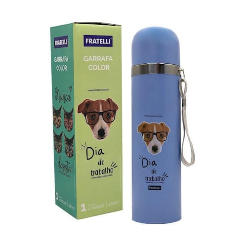 Garrafa inox color 480ml - azul com um design moderno e com diversas cores vibrantes, essa garrafa será uma ótima escolha para vocêfeita com materiais de qualidade, garantirá uma ótima durabilidade, além de contar com um excelente sistema antivazamentos, com uma tampa hermética segura, bastando apenas pressionar o botão para que a água pare de sair. Você poderá transportar a garrafa para onde quiser, seja na bolsa ou mochila, sem se preocupar com vazamentos indesejado. Feita com um design moderno e divertido, a garrafa é compacta, podendo ser guardada em vários lugares, tanto em sua mesa de trabalho ou escola, como em seu armário. Conta com variadas imagens de cachorros e gatos estampadas com diversas frases para alegrar o seu dia a dia, além de uma variedade de cores para combinar com qualquer ambiente em que esteja, conta com um suporte que da a possibilidade de pendura-lá, economizando mais espaço ainda.