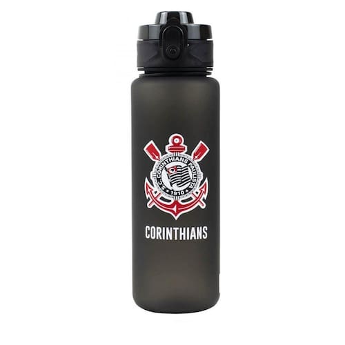 O modelo é com bico para você levar água para o trabalho, academia, escola ou jogos do Timão. O item é predominantemente preto com o brasão atual na parte frontal e atrás com o primeiro símbolo do Corinthians, de 1910.