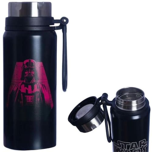 Garrafa Darth Vader Térmica 650ml Com Alça Oficial Star Wars!Cantil térmico com tampa que não vaza e não sua por fora.Conserva a temperatura do liquido por 6 horas.Sua tampa de click que evita vazamentos, caso você precise levar na bolsa ou mochila!ESPECIFICAÇÕES:* Altura: 21,5 cm* Diâmetro: 7,5 cm* Capacidade: 650 ml* Material: aço inoxidável e plástico BPA FEE* Fabricante: Zona Criativa* Produto importado*As imagens do anúncio são fotos reais do produto, sendo de ângulos diferentes da mesma peça.