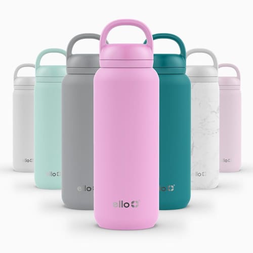 Ello Garrafa de água Cooper Twist de aço inoxidável de 947 ml com tampa de Chug | à prova de vazamento | Parede dupla e isolada a vácuo | Alça de transporte embutida | Pode ser lavada na lava-louças | - Bico de mandril: o bico estilo chug fácil de usar proporciona um fluxo suave e contínuo de hidratação, enquanto a alça incorpora uma alça de transporte fácil de usar - Mantém frio o dia todo: parede dupla e isolamento a vácuo para manter as bebidas frias por até 24 horas. Mantenha-se hidratado não importa onde a vida o leve com nossa garrafa de água confiável. - 100% à prova de vazamento: nossa garrafa possui uma vedação de parafuso segura e à prova de vazamentos, permitindo que você a jogue em sua bolsa sem preocupações. - Fácil de viajar: leve sua garrafa de água onde a vida levar você, graças à alça de transporte embutida. Prenda-o à sua mochila, bolsa de ginástica ou carregue-o à mão. - Fácil de limpar: a tampa pode ser lavada na prateleira superior da lava-louças, o que facilita a limpeza. Recomendamos lavar o corpo à mão para maior longevidade, sinta-se à vontade para jogá-lo na máquina de lavar louça, se preferir. Todas as peças são livres de BPA.