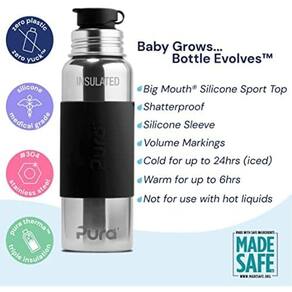 - Garrafa conversível: esta garrafa se converte facilmente em uma mamadeira infantil, garrafa com canudo ou garrafa de canudo simplesmente trocando o bico por outra tampa de silicone Pura