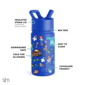 Simple Modern Garrafa de água infantil Disney Pixar com tampa de canudo | Copo de aço inoxidável isolado reutilizável para meninos, escola | Coleção Summit | 400 ml, Pixar Mashup em azul - Isolamento de parede dupla: mantém as bebidas em temperaturas ideais por horas - À prova de vazamento quando o bocal está na posição fechada; não recomendado para bebidas quentes ou gaseificadas. - Livre de BPA e lavável na lava-louças na prateleira superior - Compatível com porta-copos: garrafas de 290 a 510 ml servem na maioria dos porta-copos - Garantia vitalícia limitada e patente pendente