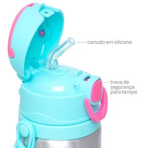 Possui canudo em silicone, tampa com trava de seguranca e cordinha antiqueda.