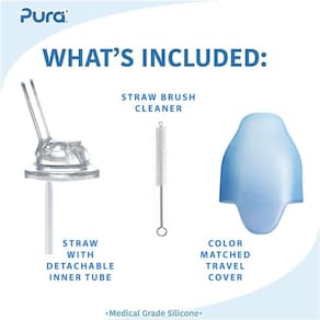 O copo de palha Pura possui uma garrafa de aço inoxidável de grau alimentício (18/8), canudo de silicone de grau médico, capa de viagem, manga e zero peças de plástico! O canudo de silicone incluído possui um design de duas peças com um canudo de silicone interno que pode ser separado da boca para facilitar a limpeza. O pedaço de silicone do canudo pode ser utilizado com o nosso canudo de silicone interno incluído. O canudo oferece um fluxo muito rápido. Ideal para crianças de 6 meses a 4 anos, este copo de canudo é compatível com todos os componentes de silicone da Pura incluindo nossos bicos de ventilação natural em várias taxas de fluxo, bico de silicone XL, discos de vedação e parte superior esportiva. Cada copo tem marcas de volume internas pressionadas que podem ser claramente vistas no interior da garrafa para facilitar a medição. A garrafa também é compatível com bicos e bicos de outras marcas. Com a Pura você pode ter certeza de que está sempre usando a garrafa mais segura e eco-progressiva do mercado. One Life... One Bottle