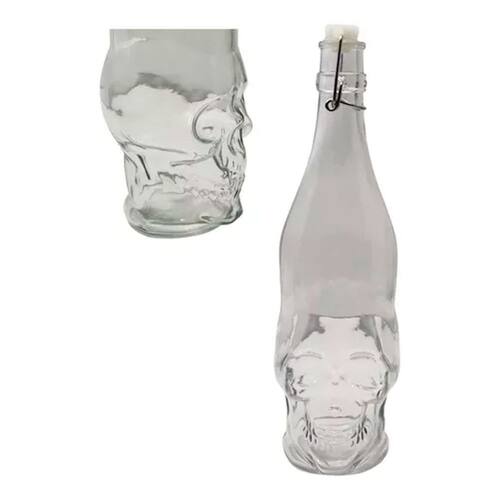 - Material: vidro - Capacidade: 450 ml - Formato: Caveira - Cor: Transparente - Com tampa rolha - Design Moderno - Estiloso e Decorativo - Sofisticado - Resistente