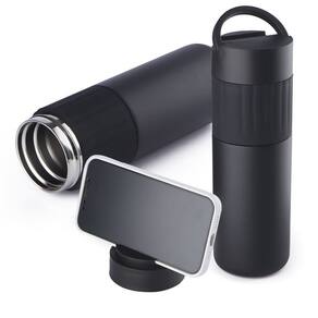 Garrafa térmica em aço inox com parede dupla isolada a vácuo, com capacidade de até 500ml. Conserva a temperatura quente ou fria, com alça e suporte para celular na tampa. Apoio para mão emborrachado e tampa rosqueável com anel de silicone para vedação.