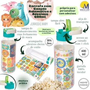 Garrafa Fun Jurassic Baby 600ml com alça, tampa Abre Fácil e canudo de acionamento automático. Acompanha ainda uma cartela com aproximadamente 24 adesivos de vinil animados que são resistentes à água.