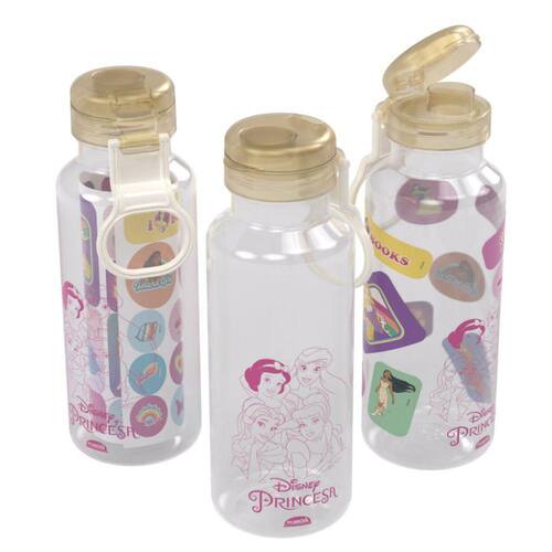 Garrafa Fun com alça e tampa Abre Fácil 600ml, produzida em polipropileno transparente de alta durabilidade, com decoração em silk das princesas mais queridas da Disney. Acompanha ainda uma cartela com aproximadamente 24 adesivos das personagens.