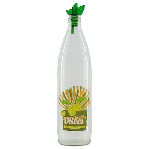 Garrafa decorada para azeite de oliva, em vidro temperado e com bico dosador.
