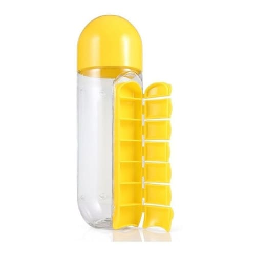 Resolva seus problemas de distância! Garrafa de água com o organizador de caixa de pílulas, uma ótima maneira de tomar a medicação. Garrafa de água com um organizador de caixa de comprimidos construído diariamente; Compartimento do organizador de sete comprimidos para cada dia da semana; Uma ótima maneira de tomar medicação enquanto viaja.