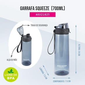 A garrafa squeeze de 700 ml é ideal para levar líquidos para a academia, escritório ou escola. Possui trava de segurança, e alça de mão em silicone. É leve e fácil de carregar. Produto com qualidade Jacki Design. (INSTRUÇÕES DE USO: Não vai ao micro-ondas; Temperatura de uso: -20C ~80C; Limpe usando uma esponja macia e detergente).