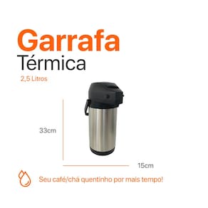 Garrafa Térmica Madri 2,5l Inox Unitermi Quente e FrioA Garrafa Térmica Madri Inox 2,5l Unitermi é ideal para manter suas bebidas na temperatura desejada por mais tempo, proporcionando uma experiência agradável a cada gole.Características:> Acionamento Por Sistema de Alavanca: Seguro e prático para servir;> Durabilidade: Fabricada em aço inoxidável de alta qualidade, resistente a impactos;> Versatilidade: Perfeita para diversos ambientes e ocasiões;Especificações Técnicas:> Capacidade: 2,5l;> Peso: 1,410 Kg;> Dimensões(CxLxA): 35,6cm x 19,7cm x 15,9cm;> Material: Ampola de aço inox e componentes em plástico polipropileno;> Conservação Térmica:- Quente: até 8h;- Frio: até 12h;Observação: O teste de funcionamento deve ser feito apenas com água, evitando danos ao produto.Instrução: Antes do uso, recomenda-se aquecer a garrafa com água fervente.