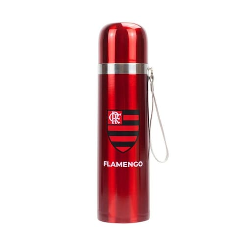 garrafa térmica com 500 ml de capacidade na cor e estampa do escudo do. Não é possível tomar direto da garrafa, ela serve para armazenar a bebida, para beber, usar a tampa como o copo. Vem com alçã para mão. Detalhes: