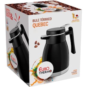 Garrafa Térmica ou Bule Térmico em Inox 1,2 litro Preto Quebec Euro Home O Bule Térmico Quebec é fabricado em aço inox com uma pintura vermelha brilhante que garante charme e elegância. Por dentro, uma parede dupla de inox garante a conservação da temperatura de bebidas quentes por até 12 horas e de bebidas geladas por até 24 horas, desde que as instruções de uso sejam seguidas. Por ser inteiramente de aço inox, sua ampola permite a utilização de cubos de gelo e não quebra em pequenas quedas. Diferentemente da maioria dos bules existentes no mercado, este bule é acionado por um gatilho, o que te dá mais segurança na hora de servir, além de ser mais higiênico. Características: - Marca: Euro; - Composição/Material: Inox e Plástico; - Capacidade: 1,2 Litro; - Referência: BT5508PT; - Cor: Preta; - Eficiência térmica: 12 horas para bebidas quentes e 24 horas para bebidas geladas. Dimensões da embalagem: - Altura: 22 cm; - Largura: 18 cm; - Profundidade: 15 cm - Peso: 0,85 Kg
