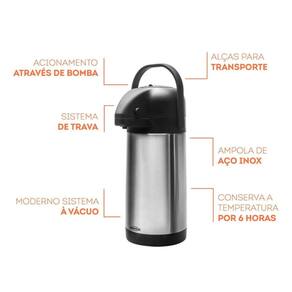Com estrutura em alumínio que não acumula resíduos e facilita a limpeza, a Garrafa térmica de 1,9L da Brinox possui ampola de aço inox com sistema a vácuo que, conserva a temperatura da sua bebida quente ou fria por mais tempo, garantindo até 6 horas de autonomia. Seu acionamento, através de uma bomba, potencializa a pressão e facilita a saída do líquido. Além disso, a garrafa possui uma trava que garante mais segurança ao utilizar líquidos quentes. Sua alça de transporte facilita a mobilidade do produto. Nessa versão, com 1,9 L de capacidade e 22 X 15,5 X 30,5 cm de dimensão. Material: Aço Inox Composição: 01 Garrafas Térmicas Marca: Brinox Linhas: Garrafa Térmicas Tipo de Produto: Ferramentas de Cozinha