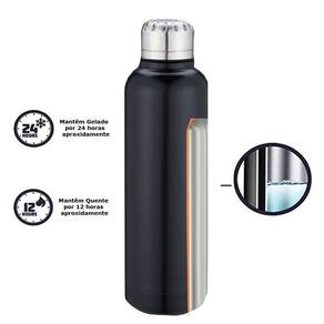 Garrafa térmica de 500m inox Gold Sports com boca estreita. Muito eficiente na conservação da temperatura de bebidas geladas ou quentes e também segura muito bem o gás de refrigerantes. A tampa, sem bem fechada, veda totalmente a garrafa, impedindo respingos e vazamentos.Características: