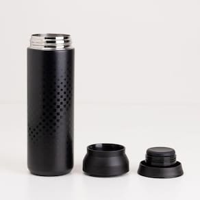 tampa rosqueável (em plástico), para manter a sua bebida bem conservada; tampa/bocal dosadora rosqueável (em plástico); garrafa em aço inox.