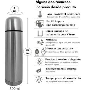 Garrafa Térmica Inox 500 ml Café Chá Shake Água Quente Gelada Tampa Click Parede Dupla Isolada Vácuo Prata Antivazamento