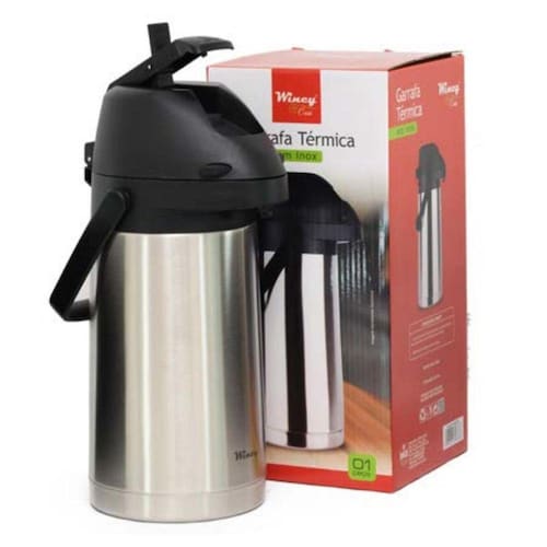 Garrafa Térmica Inquebrável 1,6 Litros em Inox Pressão - Wincy Cobertura em verniz: não suja e nem deixa marcas; facilidade para servir; sistema de servir por alavanca com alta eficiência, em inox inquebrável, para líquidos quentes e frios; corpo externo em aço inoxidável, acabamento escovado, tampa em polipropileno PP . Alça retrátil para transporte. Eficiência térmica até 8 horas para líquidos quentes, e até 12 horas para líquidos frios. Altura : 30 cm Capacidade : 1,6 L Cor da Tampa : Preto Cor Predominante : Prata Diâmetro : 15 cm Itens Inclusos : 1 Garrafa Térmica Material : Inox Material da Alça : Polipropileno Material da Tampa : Polipropileno Peso : 1,5 kg