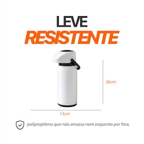 Capacidade de 1,8 litro Cor branca com acabamento elegante e discreto Tampa e alça em polipropileno resistente Ampola interna de vidro, ideal para manter bebidas quentes ou frias por horas Acionamento por pressão para uso prático e seguro Design funcional, com alça para transporte fácil e uso em qualquer ocasião