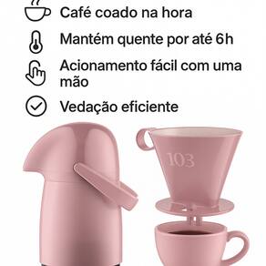 Suporte para filtro de café tamanho 103 Encaixe ideal para bules e térmicas Garrafa térmica com sistema de jato diagonal exclusivo Conserva até 12h gelado e 6h quente Capacidade ideal de 500ml Design moderno, resistente e funcional