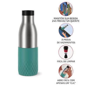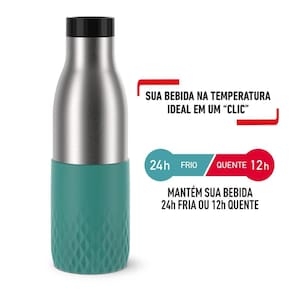 Sua bebida na temperatura ideal com apenas um ""clic"" usando a Garrafa Térmica Tefal Bludrop Verde 500ml, que mantém sua bebida por até 24h fria ou 12h quente. Esta garrafa, feita de aço inoxidável durável com acabamento em silicone, não só oferece estilo, mas também muito mais firmeza e segurança no seu dia a dia. Design feito 100% à prova de vazamentos, torna o transporte fácil e sem preocupações. Botão abre e fecha fácil com apenas um ""clic"", centralizado na tampa para não entrar em contato com a sua bebida. Diferenciais: - Mantém sua bebida 24h fria ou 12h quente. - Abre fácil, com apenas um ""clic"" - À prova de vazamentos. - Acabamento em silicone, muito mais firmeza. - Compatível com máquina de lavar louças. - Aço inoxidável: Material com isolamento térmico e resistente. - Fácil de limpar: Tampa totalmente desmontável. Desfrute da praticidade e elegância, garantindo que sua bebida esteja sempre na temperatura ideal em um ""clic"" com a Garrafa Térmica Tefal Bludrop Verde de 500ml.