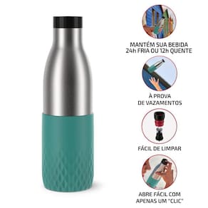 Sua bebida na temperatura ideal com apenas um ""clic"" usando a Garrafa Térmica Tefal Bludrop Verde 700ml, que mantém sua bebida por até 24h fria ou 12h quente. Esta garrafa, feita de aço inoxidável durável com acabamento em silicone, não só oferece estilo, mas também muito mais firmeza e segurança no seu dia a dia. Design feito 100% à prova de vazamentos, torna o transporte fácil e sem preocupações. Botão abre e fecha fácil com apenas um ""clic"", centralizado na tampa para não entrar em contato com a sua bebida. Diferenciais: - Mantém sua bebida 24h fria ou 12h quente. - Abre fácil, com apenas um ""clic"" - À prova de vazamentos. - Acabamento em silicone, muito mais firmeza. - Compatível com máquina de lavar louças. - Aço inoxidável: Material com isolamento térmico e resistente. - Fácil de limpar: Tampa totalmente desmontável. Desfrute da praticidade e elegância, garantindo que sua bebida esteja sempre na temperatura ideal em um ""clic"" com a Garrafa Térmica Tefal Bludrop Verde de 700ml.