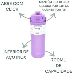Zona Criativa – Garrafa Térmica Vita Açaí 700ml Prática, estilosa e feita para acompanhar sua rotina, a Garrafa Térmica Vita Açaí 700ml da Zona Criativa une funcionalidade e design moderno em um só produto. Com estampa inspirada na tonalidade vibrante do açaí, ela é perfeita para quem gosta de acessórios cheios de personalidade. Ideal para o trabalho, academia, escola ou passeios, possui capacidade de 700ml, oferecendo hidratação na medida certa ao longo do dia. Sua estrutura com parede dupla e isolamento térmico ajuda a conservar bebidas quentes ou frias por muito mais tempo, mantendo a temperatura ideal por horas. Diferenciais do produto: