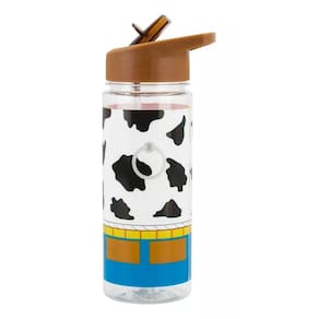 Jogo com garrafa de plástico com canudo capacidade para 450 ml e uma mochila do tipo saco de 30 x 40 cm de dimensão. Ambos customizados com características do personagem Woody do filme Toy Story. Material: plástico e políester