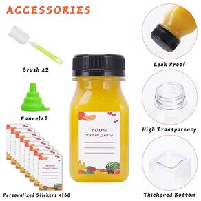 - ?Para uso amplo? Pode ser utilizado para uma variedade de cenas. Você receberá 150 garrafas plásticas vazias reutilizáveis com tampas à prova de vazamento, um funil de borracha, uma escova de esponja e alguns rótulos. Você pode usar as garrafas transparentes para guardar suas várias bebidas no trabalho ou em casa, como suco, chá, água, bebidas e outras bebidas, ou também pode levá-las para piqueniques, acampamento, festas de aniversário e outros eventos.