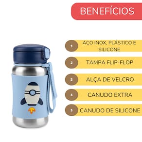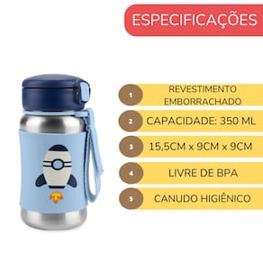 Idade Indicativa: A partir de 12 meses. Material: Aço inoxidável com capa de silicone. Capacidade: 350 ml. Medidas: 6,85 x 6,85 x 15,24 cm. Livre de: BPA, Ftalatos e PVC. Especificações de Limpeza e Manutenção: