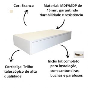 Cor: BrancoMaterial: MDF/MDP de 15mm, garantindo durabilidade e resistênciaCorrediça: Trilho telescópico de alta qualidadePeso suportado: até 20 kgProduto enviado desmontado com manual de instruçãoInclui kit completo para instalação, com cantoneiras, buchas e parafusos, montagem simples e rápida, sem necessidade de ajuda externaNão perca a oportunidade de transformar seu espaço! Adicione um toque de organização e modernidade ao seu quarto ou penteadeira. Clique no botão “Comprar” agora e aproveite nossas condições especiais!
