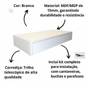 Cor: BrancoMaterial: MDF/MDP de 15mm, garantindo durabilidade e resistênciaCorrediça: Trilho telescópico de alta qualidadePeso suportado: até 20 kgProduto enviado desmontado com manual de instruçãoInclui kit completo para instalação, com cantoneiras, buchas e parafusos, montagem simples e rápida, sem necessidade de ajuda externaNão perca a oportunidade de transformar seu espaço! Adicione um toque de organização e modernidade ao seu quarto ou penteadeira. Clique no botão “Comprar” agora e aproveite nossas condições especiais!
