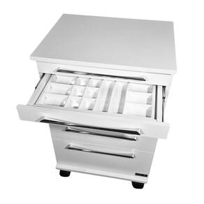 Branco, a combinação da cor branca com puxadores cromados é ideal para ambientes clínicos e consultórios, pois transmite sensação de limpeza, organização e sofisticação. O branco amplia visualmente os espaços e contribui para um ambiente mais iluminado, enquanto os puxadores cromados adicionam um toque moderno e profissional. Essa dupla oferece praticidade, sendo fácil de limpar e resistente ao uso frequente, além de criar uma atmosfera tranquila e acolhedora para pacientes e profissionais.