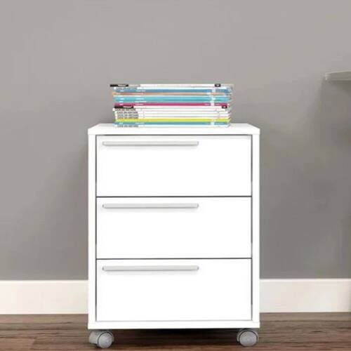 Caracteristicas: 3 Gavetas com corredicas metalicas 4 Rodizios Acabamento U.V Fosco Capacidade do tampo 10 kg e gaveta 3 kg Estrutura em MDP 15mm Estrutura fundos MDF 3mm Puxadores de Plastico Revestimento Finish Foil -FF-