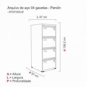 Produto confeccionado em chapa de aço 26 e 24, destinado a utilização de armazenamento de documentos por meio de pastas suspensas, com visual moderno possibilitando uma harmonia em seu ambiente de trabalho. Acabamento da Gaveta: Pintura Acabamento dos Pés: Polipropileno Altura dos Pés: 3 cm Ambiente Principal: Escritório Complexidade da Montagem: Média: pode ser montado por mais de uma pessoa e/ou necessite de maior conhecimento para montagem Cor: Cinza Cor do Produto: Cinza Cor Flex: Não Cor Interna: Cinza Escala de Brilho: Semi-Fosco Escala de Brilho da Gaveta: Semi-Fosco Gaveta com Chave: 01 Informações Complementares: Utilizar um pano levemente umedecido com água, para finalizar utilizar um pano seco. Itens Inclusos: 1 Gaveteiro, Kit Ferragens e Manual de Montagem Linha ou Coleção: OF04SLTCM Manual de Especificação Técnica: https://cdn2.madeiramadeira.com.br/atributo/pandin/867179-11-e987-0011.pdf Manual de Montagem e Instalação: https://cdn2.madeiramadeira.com.br/atributo/pandin/867178-11-e987-0011.pdf Material da Gaveta: Aço Material do Puxador da Gaveta: PVC Material dos Pés: Polipropileno Material Principal: Aço Montagem Flex: Não Necessita Montagem: Sim Origem do Produto: Nacional Pés Reguláveis: Sim Peso: 24,76 kg Peso Máximo por Gaveta: 25 kg Possui Pés: 04 Possui Portas: Não Possui Prateleiras: Não Recomendações de Uso, Manutenção e Limpeza: Utilizar um pano levemente umedecido com água, para finalizar utilizar um pano seco. Rodízio com Trava: Não Sapatas Niveladoras: Sim Sistema de Montagem: Encaixe Suporta Até (kg): 100 kg Tamanho: Tipo de Corrediça da Gaveta: Metálica Telescópica Tipo de Puxador da Gaveta: Embutido