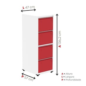 Produto confeccionado em chapa de aço 26 e 24, destinado a utilização de armazenamento de documentos por meio de pastas suspensas, com visual moderno possibilitando uma harmonia em seu ambiente de trabalho. Acabamento da Gaveta: Pintura Ambiente Principal: Escritório codigo_ean: 7900288088505 Complexidade da Montagem: Média: pode ser montado por mais de uma pessoa e/ou necessite de maior conhecimento para montagem Cor: Branco/Vermelho Cor do Produto: Branco/Vermelho Cor Flex: Não Cor Interna: Branco/Vermelho Escala de Brilho: Semi-Fosco Escala de Brilho da Gaveta: Semi-Fosco Gaveta com Chave: 01 Informações Complementares: Utilizar um pano levemente umedecido com água, para finalizar utilizar um pano seco. Itens Inclusos: 1 Gaveteiro, 1 Kit Ferragens, 1 Manual de Montagem Linha ou Coleção: OF04SLTCM Manual de Especificação Técnica: https://product-hub-prd.madeiramadeira.com.br/980517/documents/86a50bf9-ab95-43ac-9434-ac5c52c6dd154b9957af9e86721411e9870011.pdf Manual de Montagem e Instalação: https://product-hub-prd.madeiramadeira.com.br/980517/documents/ff36f5c2-7e2f-4091-9925-9fec74c738435b6040845125925711e9870011.pdf Marca: Pandin Móveis Material da Gaveta: Aço Material Principal: Aço Montagem Flex: Não Necessita Montagem: Sim Origem do Produto: Nacional Peso: 24,76 kg Peso Máximo por Gaveta: 25 kg Possui Acabamento na Parte de Trás: Não Possui Gaveta para Pasta Suspensa: Sim Possui Portas: Não Possui Prateleiras: Não Recomendações de Uso, Manutenção e Limpeza: Utilizar um pano levemente umedecido com água, para finalizar utilizar um pano seco. Sapatas Niveladoras: Sim Sistema de Montagem: Encaixe Suporta Até (kg): 100 kg Tipo de Corrediça da Gaveta: Metálica Telescópica Tipo de Gaveteiro: De Chão Tipo de Puxador da Gaveta: Embutido