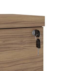 Ele acompanha chave para travamento da gaveta superior, e rodízios que garantem maior praticidade. É versátil, pois possui traseira revestida, permitindo o uso em qualquer posição.