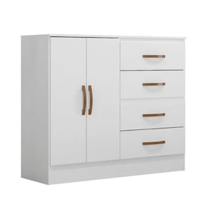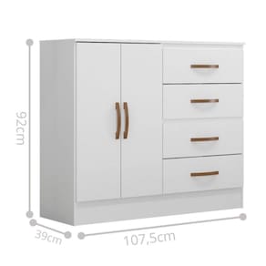 Feito em MDP. Contém 4 gavetas com corrediças metálicas facilitando a abertura e deslizamento, e 2 portas.
