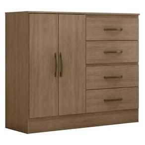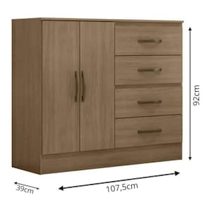 Feito em MDP. Contém 4 gavetas com corrediças metálicas facilitando a abertura e deslizamento, e 2 portas.